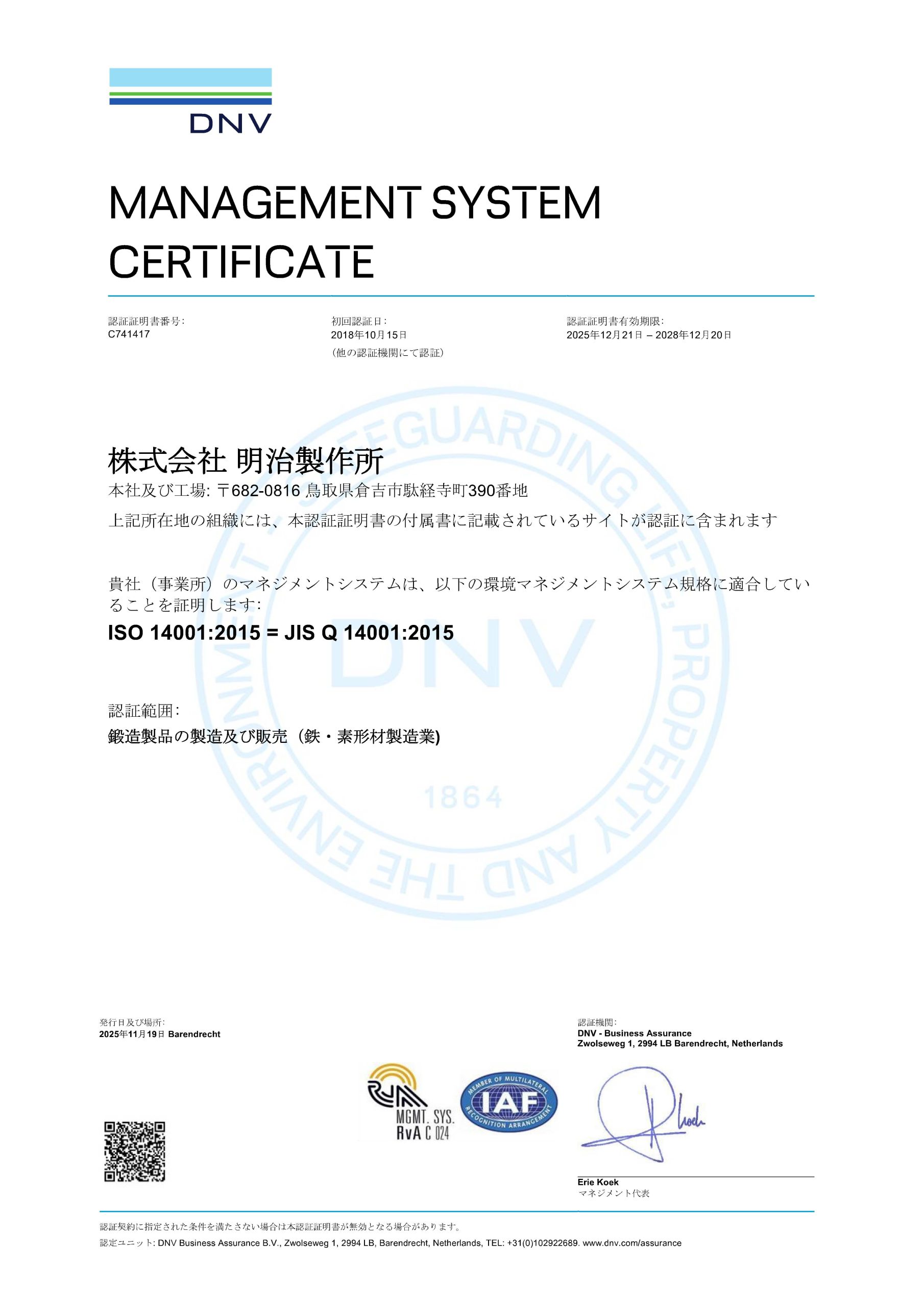 株式会社明治製作所は、鍛造品を供給する事業活動において、環境マネジメントシステムを構築し、地球にやさしい環境づくりに取り組む。